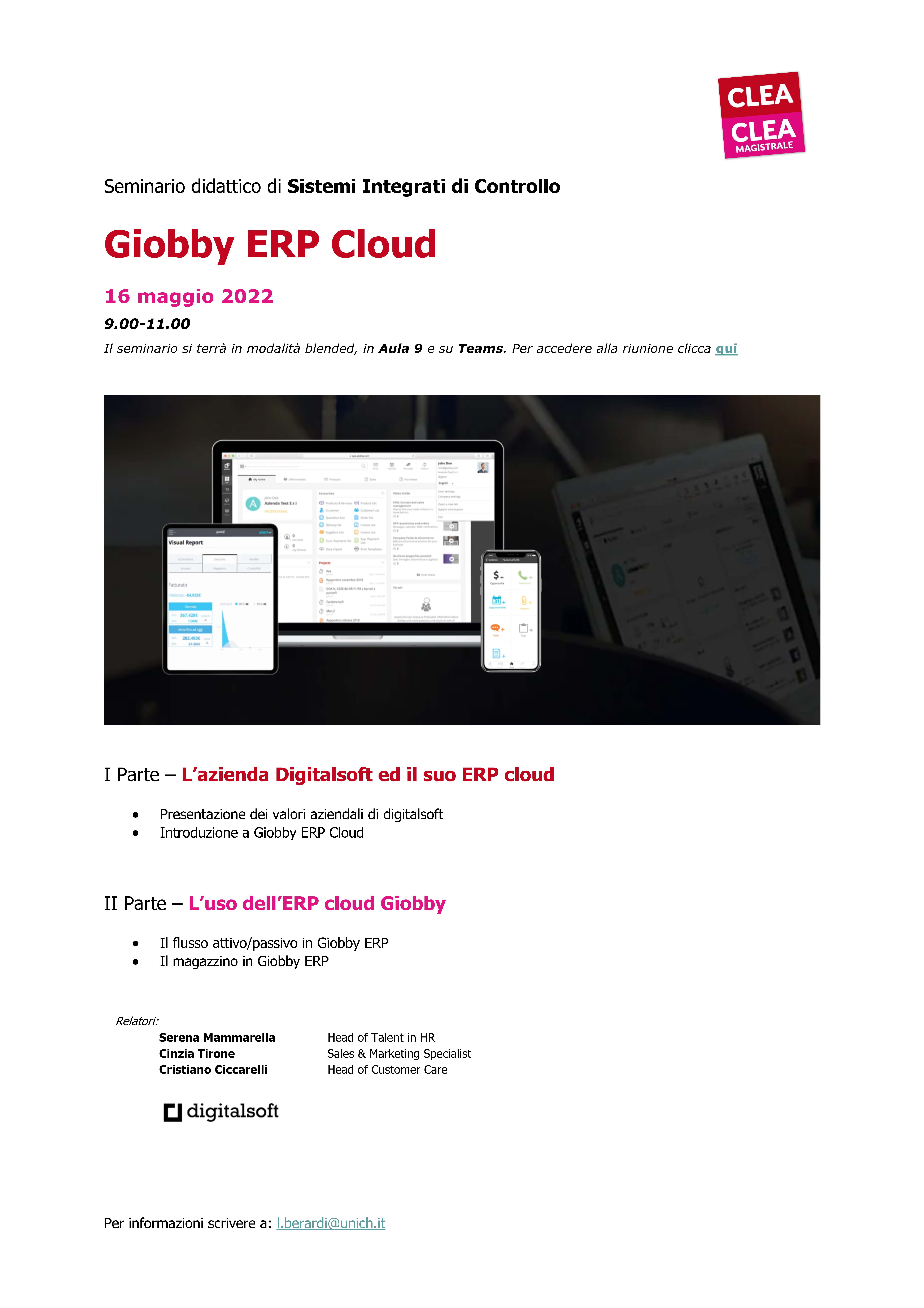 Il 16 maggio si terrà IN PRESENZA in aula 9 (ore 9:00-11:00) il seminario professionalizzante sull'ERP cloud Giobby della Digitalsoft.
